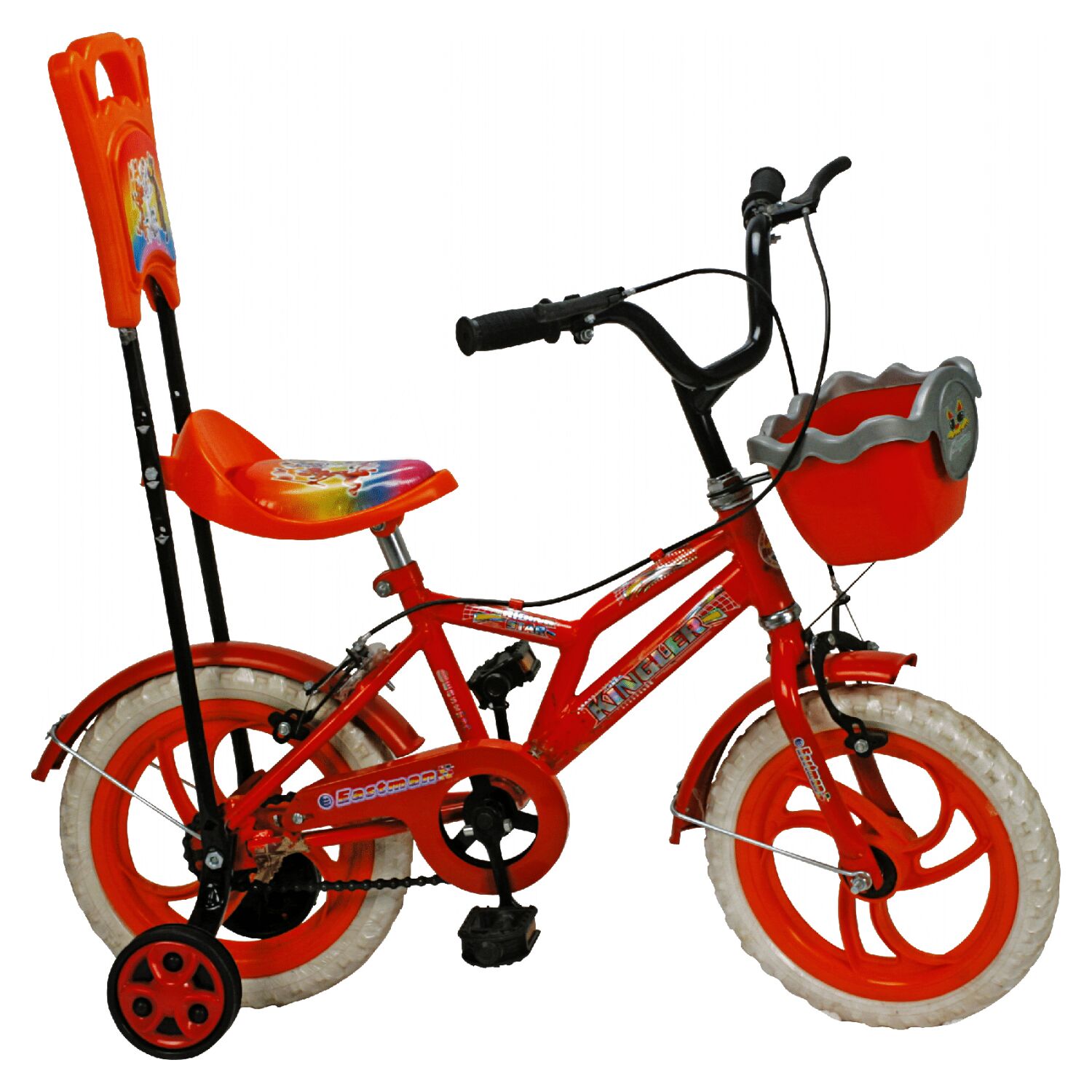 | Side Pull Caliper Brakes Powder Coated | Plastic Base Vinyl Top with Sissy Bar | 14” Plastic Rims in Assorted Colors | 14”, EVA Tyres | Plastic Basket Side Supports |